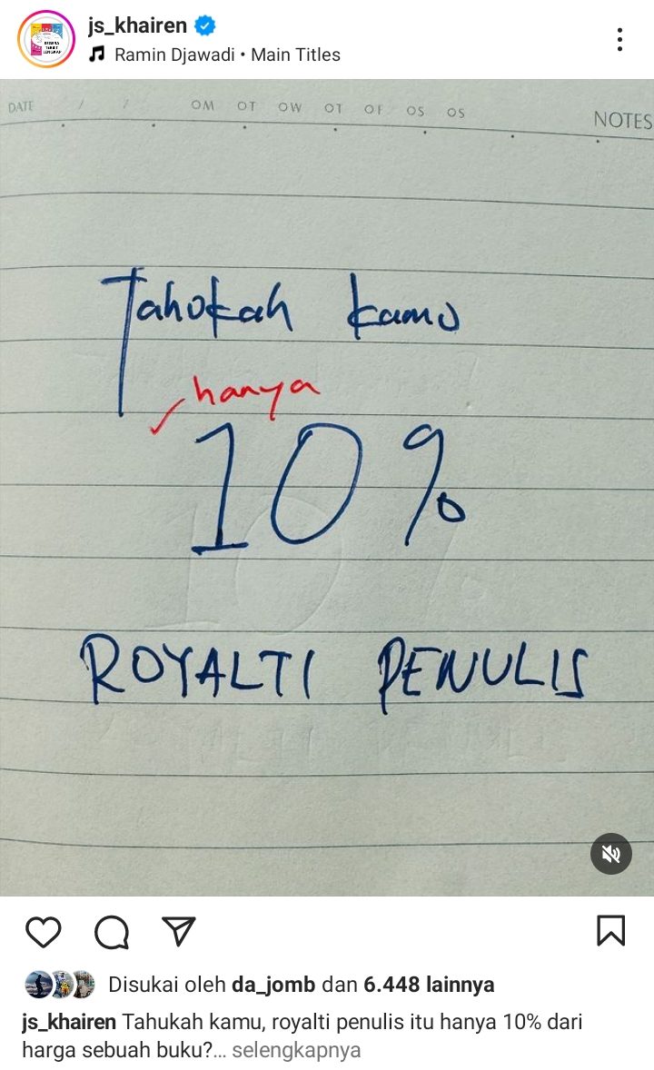 Beberapa hari lalu, aku membaca tulisan J.S Khairen di laman sosial medianya tentang royalti penulis. Katanya, royalti penulis itu hanya 10% dari harga jual buku. Jika buku dijual kisaran harga 80.000 – 120.000 per buku, artinya yang masuk ke dalam kantong penulis hanya 8 – 12 ribu saja. Angka itu digunakan untuk biaya riset yang berbulan-bulan sampai bertahun-tahun, biaya membuat kerangka berpikir, ngetik berjam-jam, pusing, melamun, revisi. Pun digunakan untuk potong pajak, membuat konten, talkshow, menulis quote, dan semacamnya.