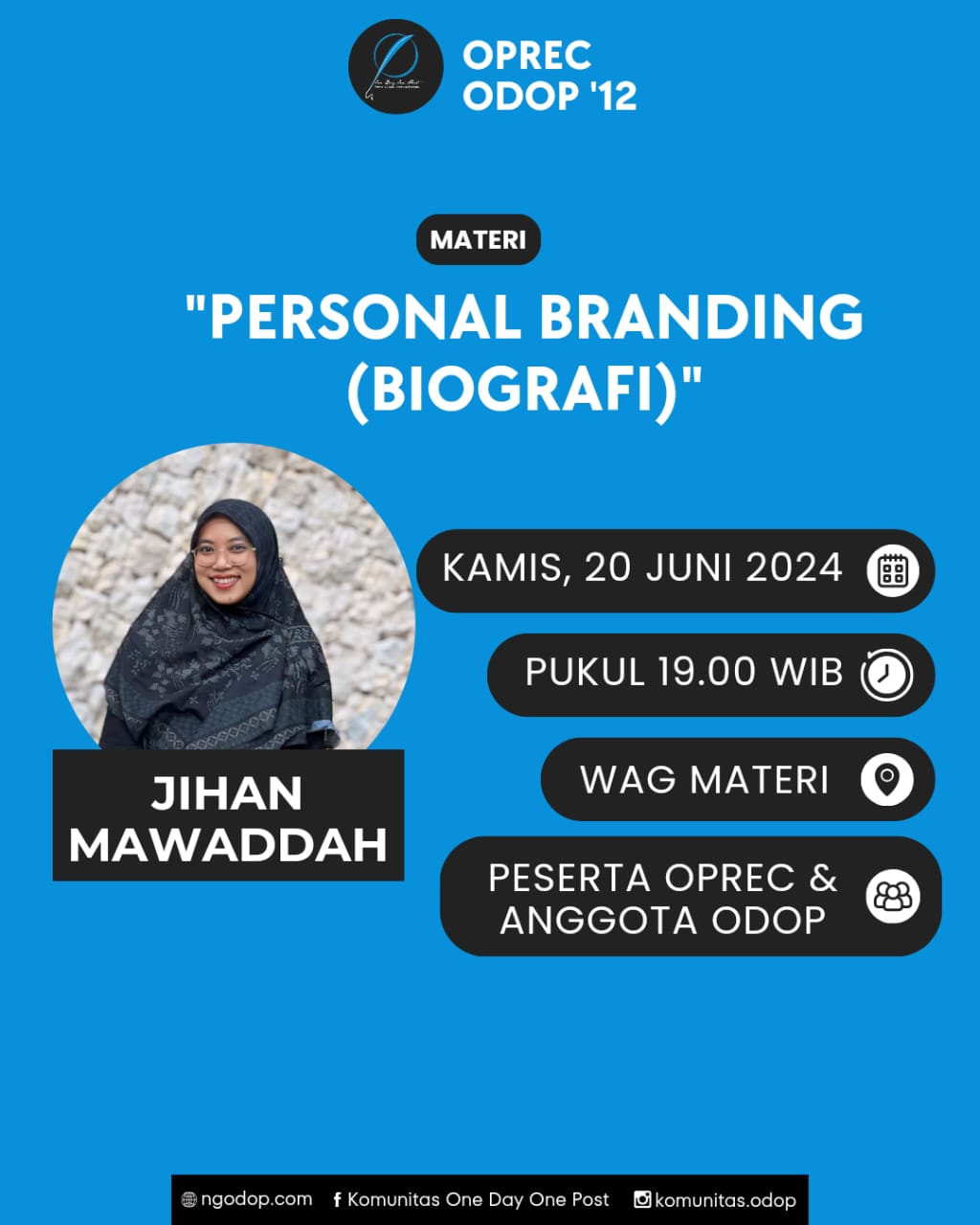 Kutipan di atas kutandai betul. Mbak Ji, penyampai materi kali itu sekaligus ketua komunitas ODOP periode ini memaparkan personal branding dengan begitu elegan. Kutuliskan resumenya ini sebagai pengikat ilmu dari materi yang telah disampaikan. Bagi kalian yang membacanya semoga memperkaya khazanah pemahaman dan pengetahuan.